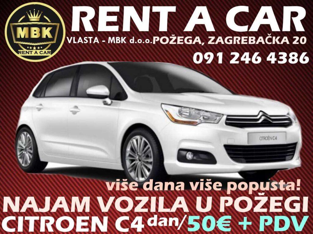 Ako tražite izvanrednu uslugu najma automobila, “Vlasta MBK” je najbolji izbor za rent a car Požega. Smješteni na adresi Zagrebačka 20, naše usluge iznajmljivanja vozila Požega su uvijek dostupne za vaše potrebe. Naša tvrtka, “Vlasta MBK”, je sinonim za kvalitetu i pouzdanost kada je u pitanju najam vozila Požega. Opremljeni smo s nizom vozila Citroen C4, spremnih da zadovolje sve vaše zahtjeve za najam automobila.
